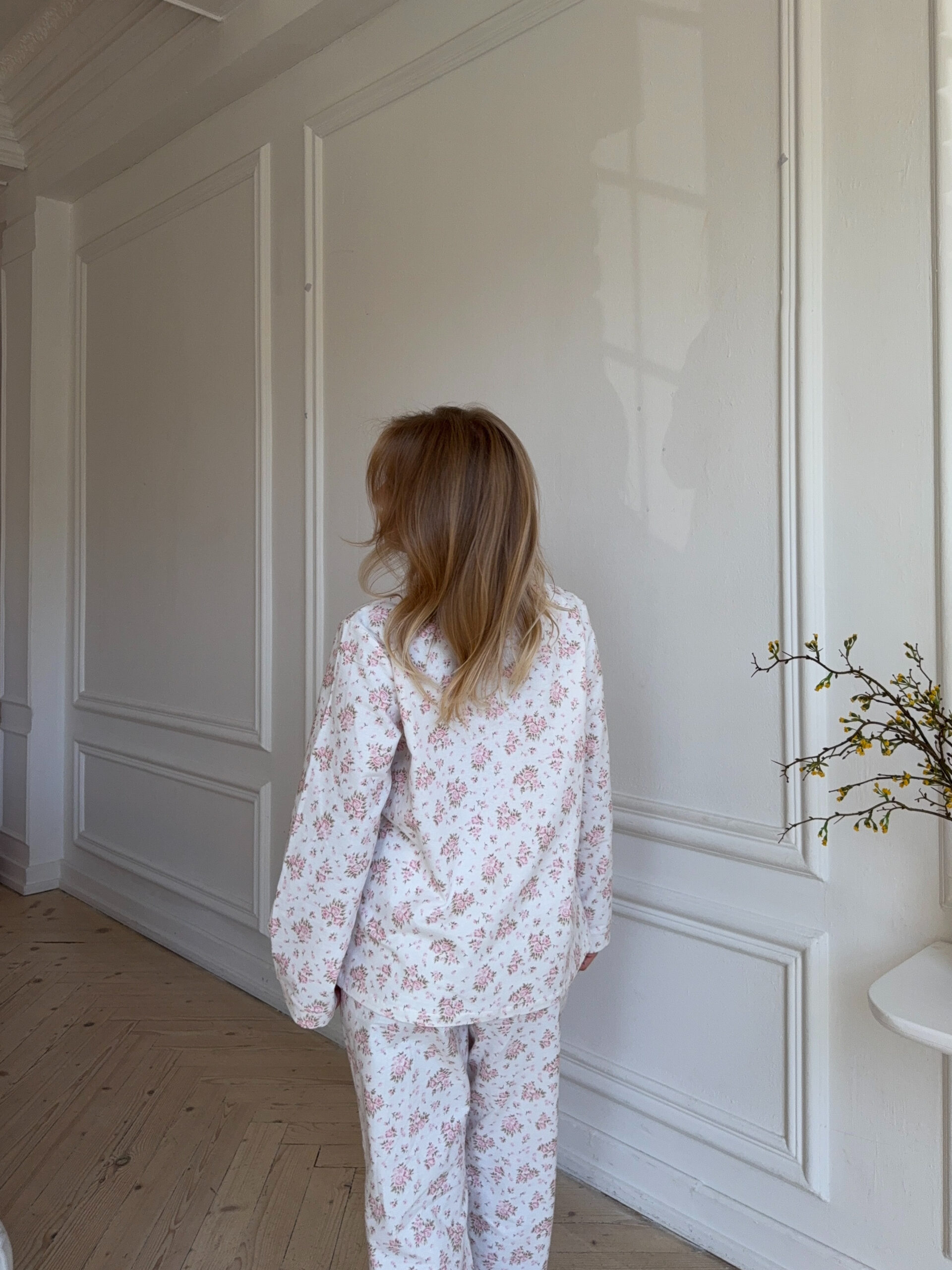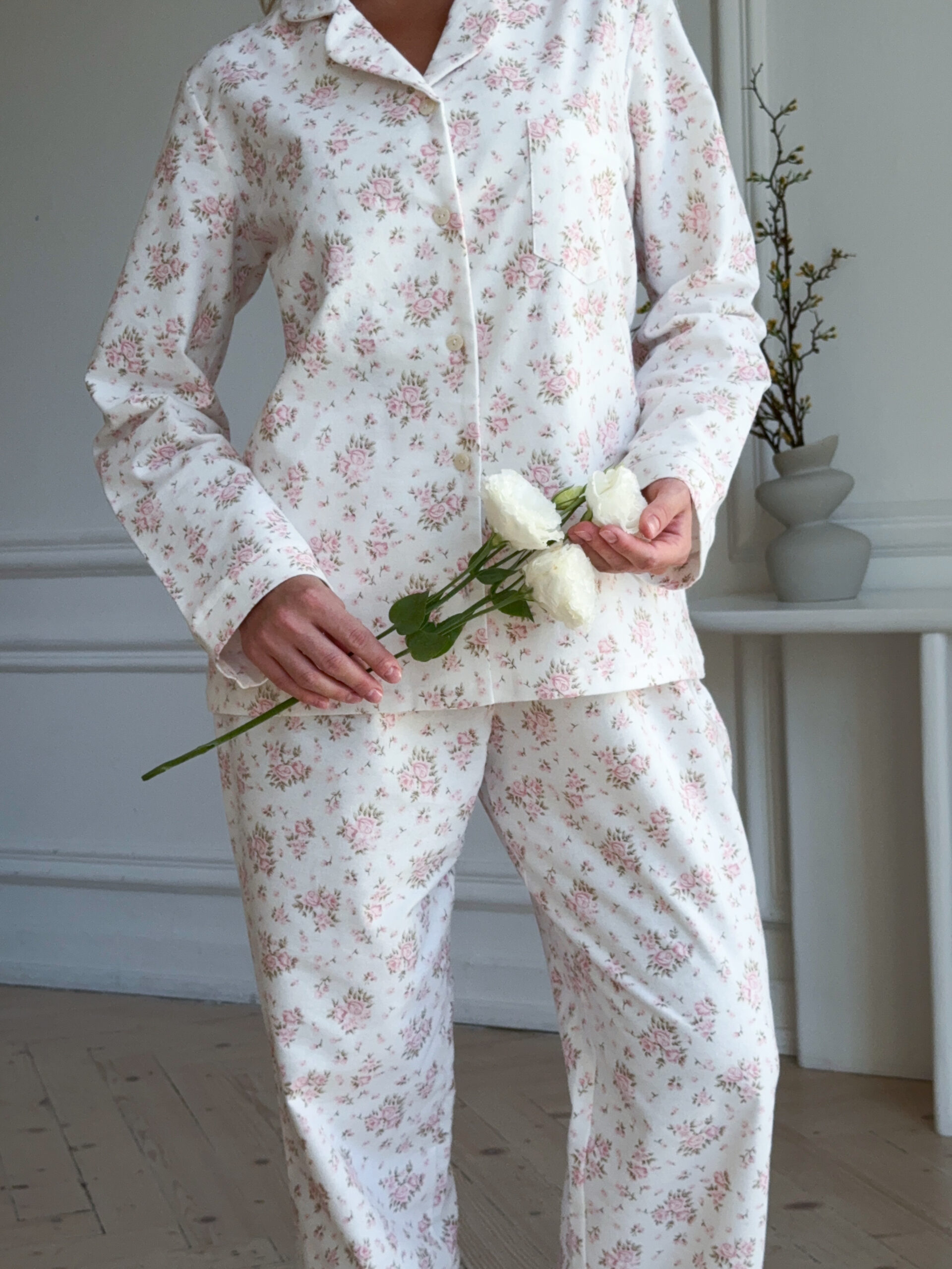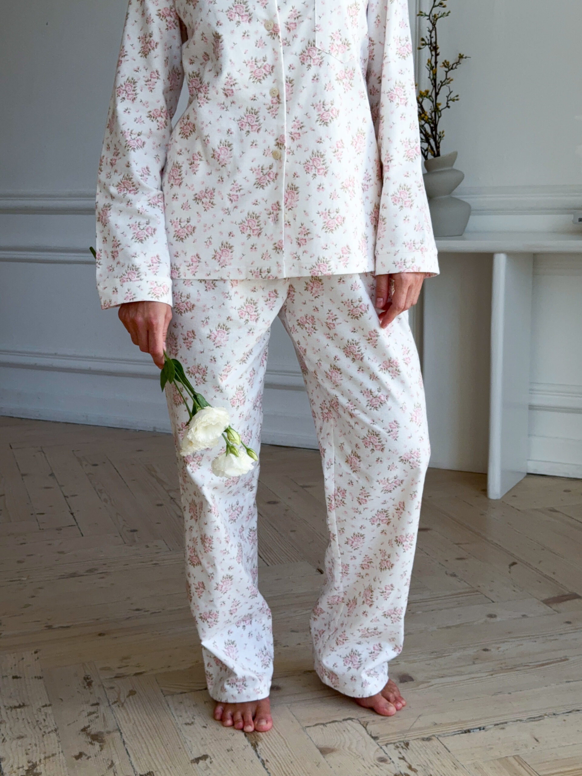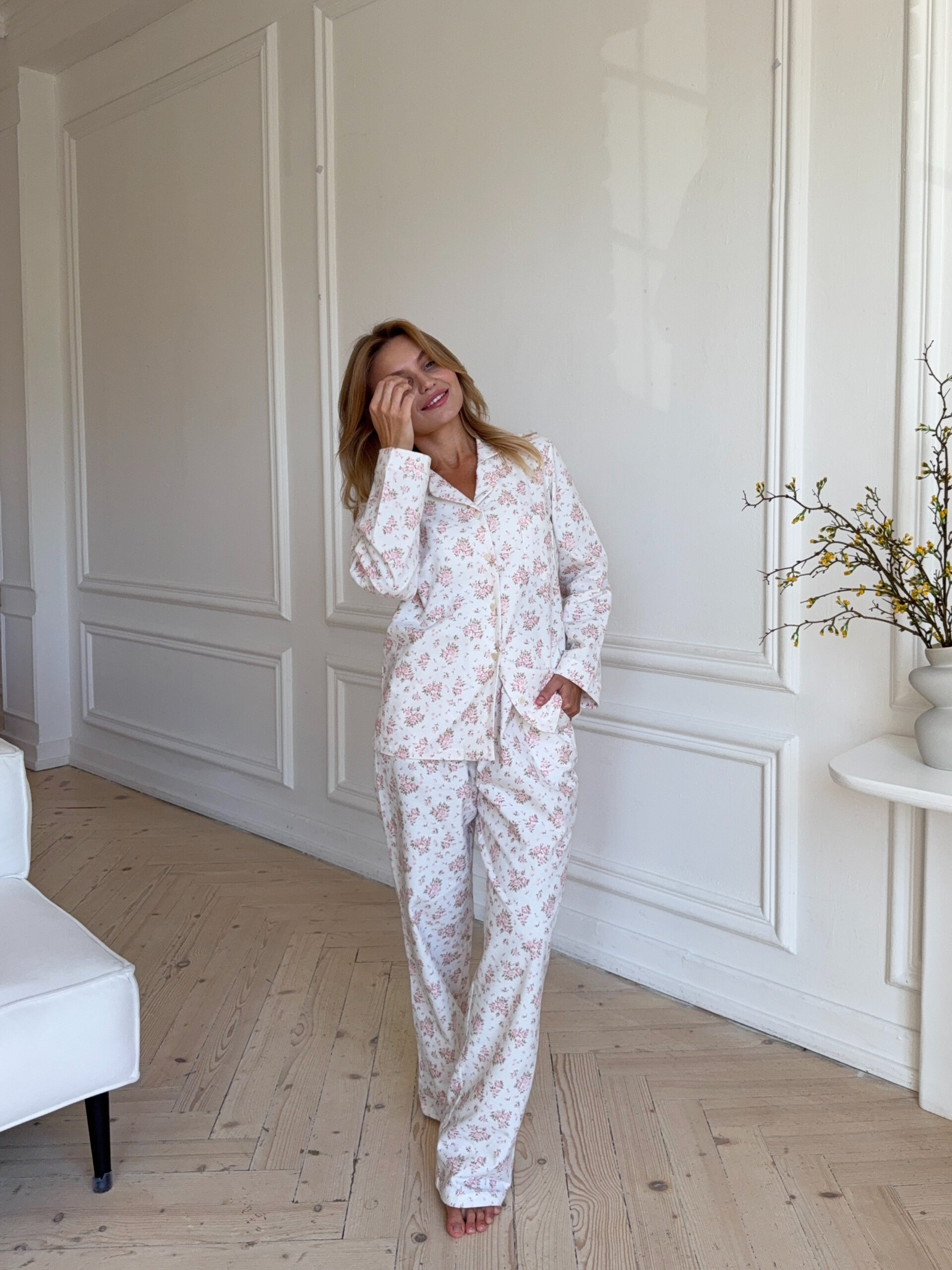 Pyjama set made from lightweight, soft fabric featuring an all-over floral print. Designed with a relaxed fit, it includes a long-sleeve button-up top with a classic collar and matching straight-leg trousers, offering everyday comfort and a timeless sleepwear look.