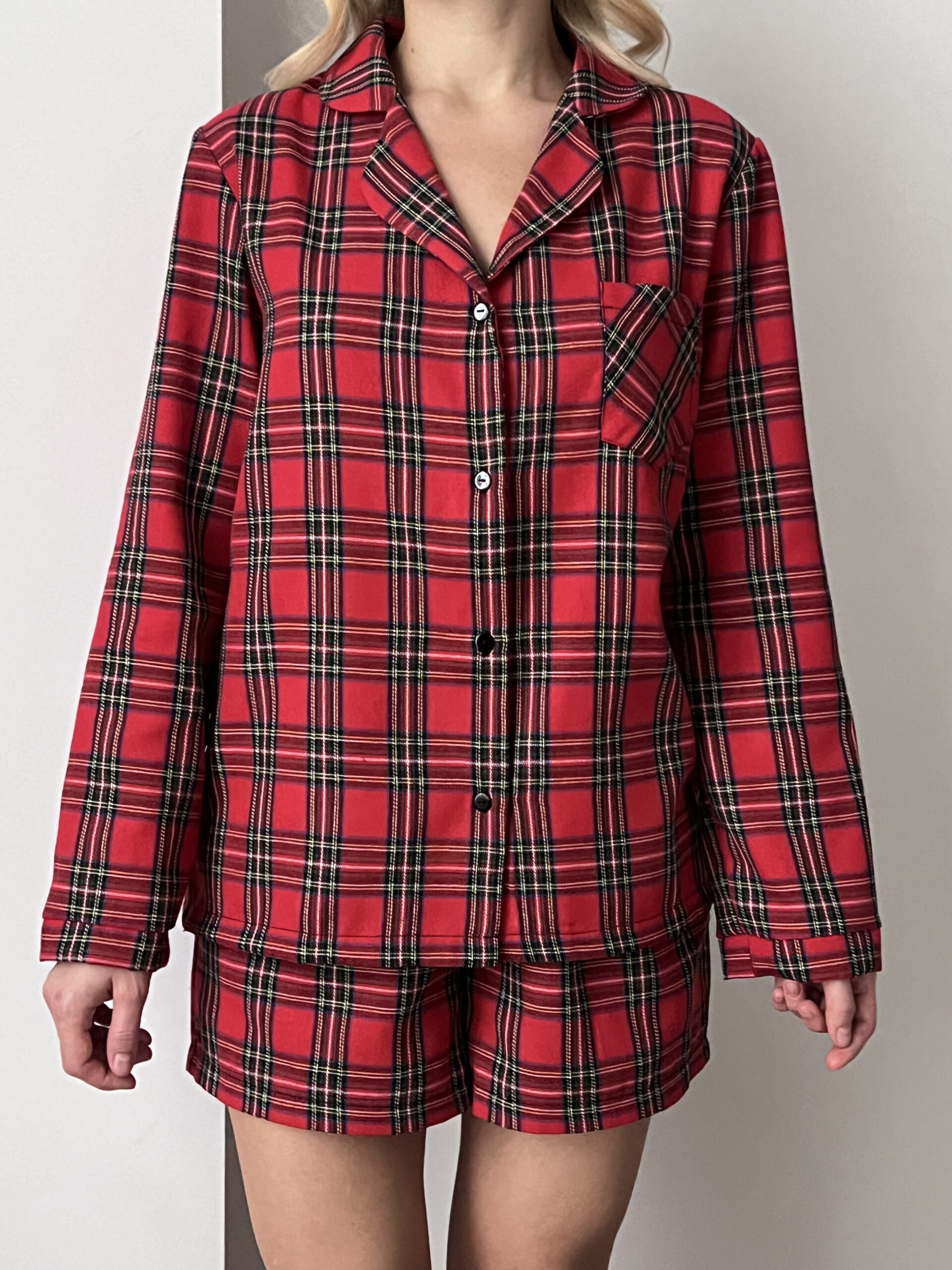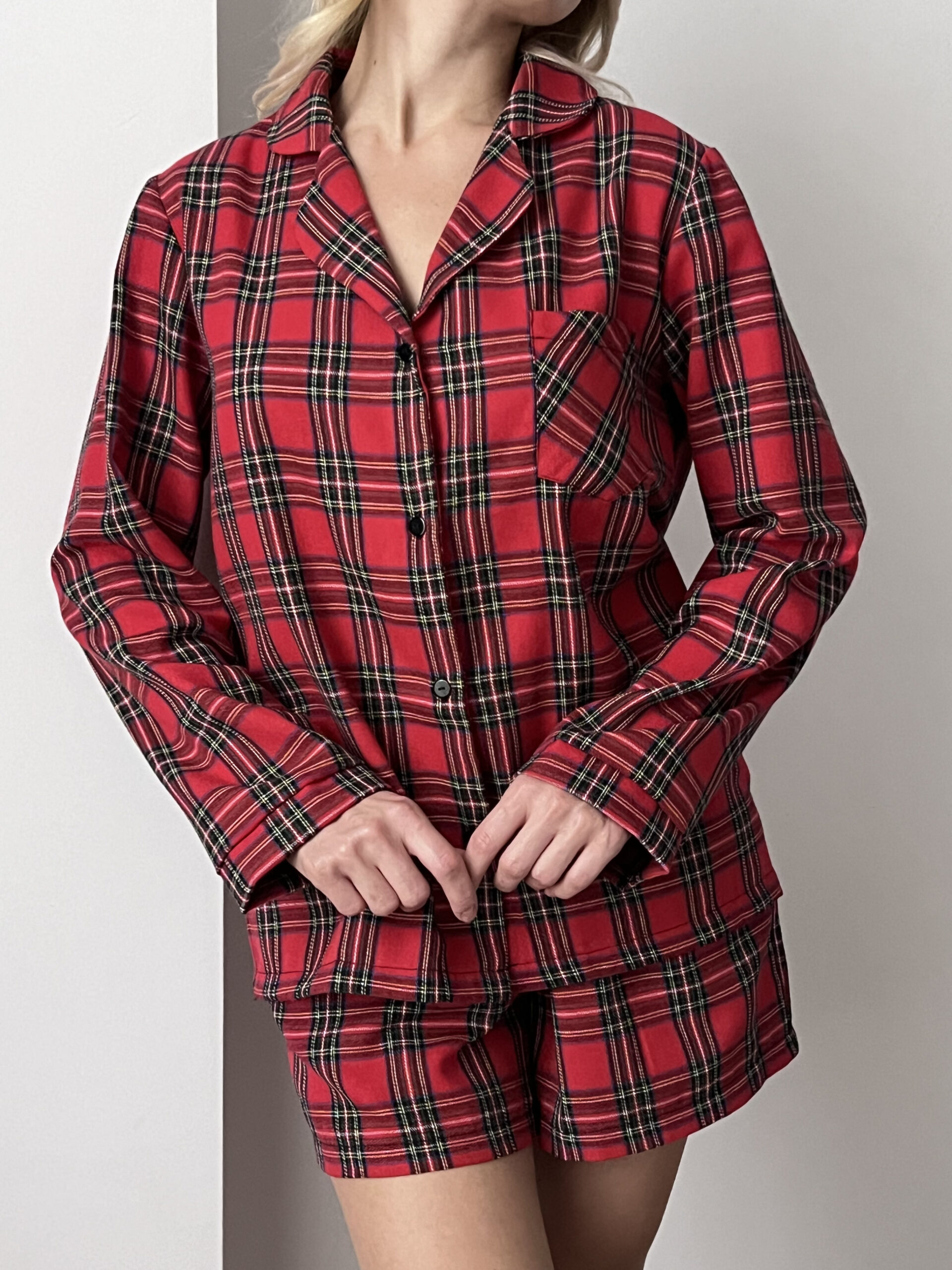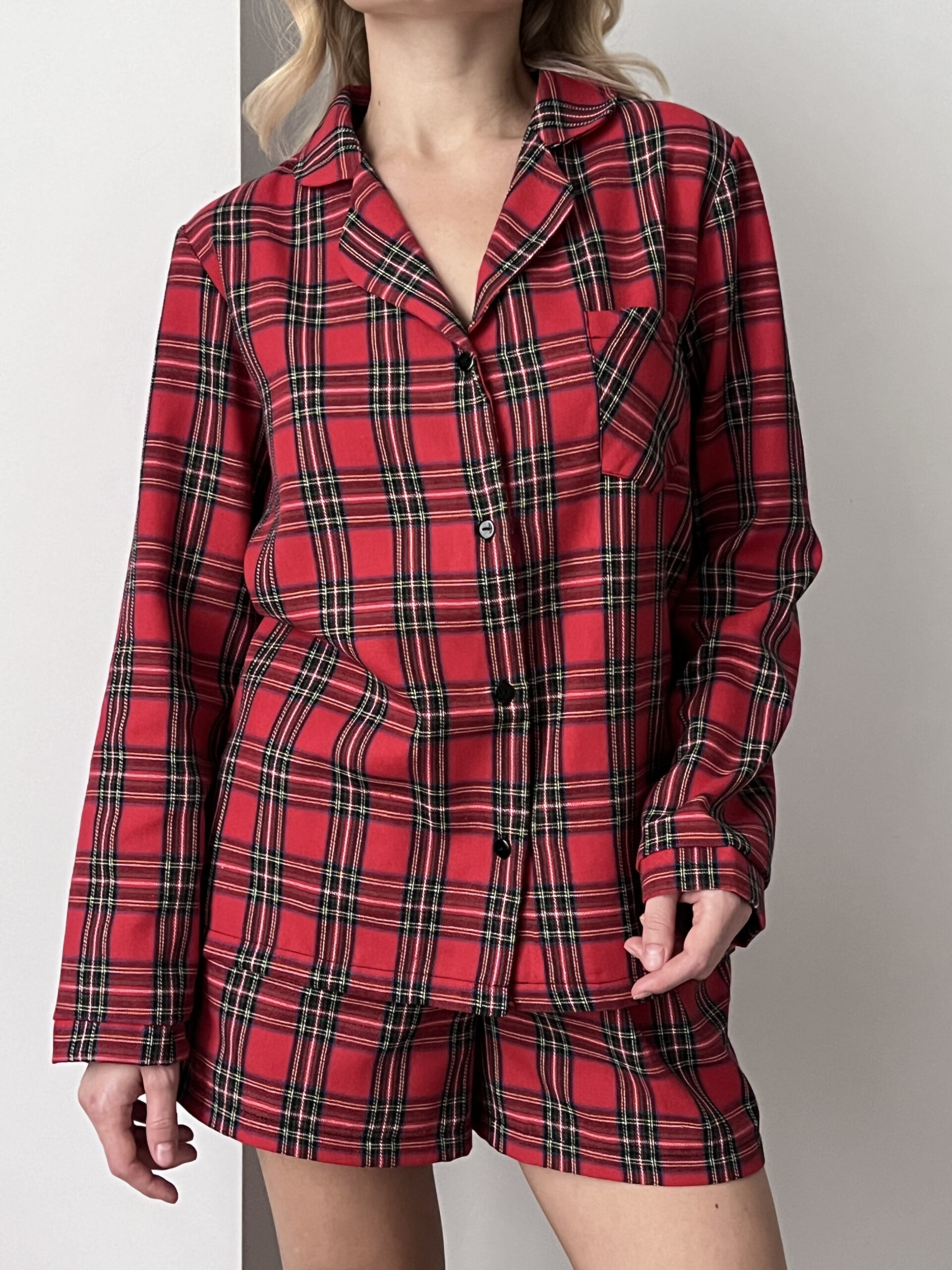 Pyjama set made from soft, breathable fabric featuring a classic red tartan pattern. Designed with a relaxed fit, the set includes a long-sleeve button-up shirt with a classic collar and matching shorts with an elastic waistband, offering lightweight comfort and ease of movement for warmer nights.