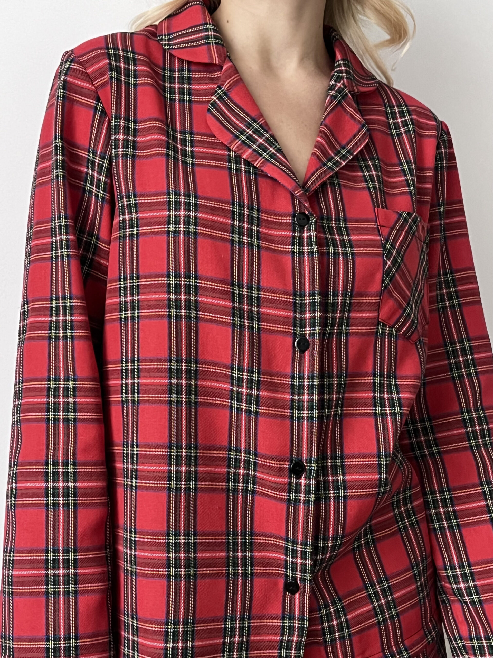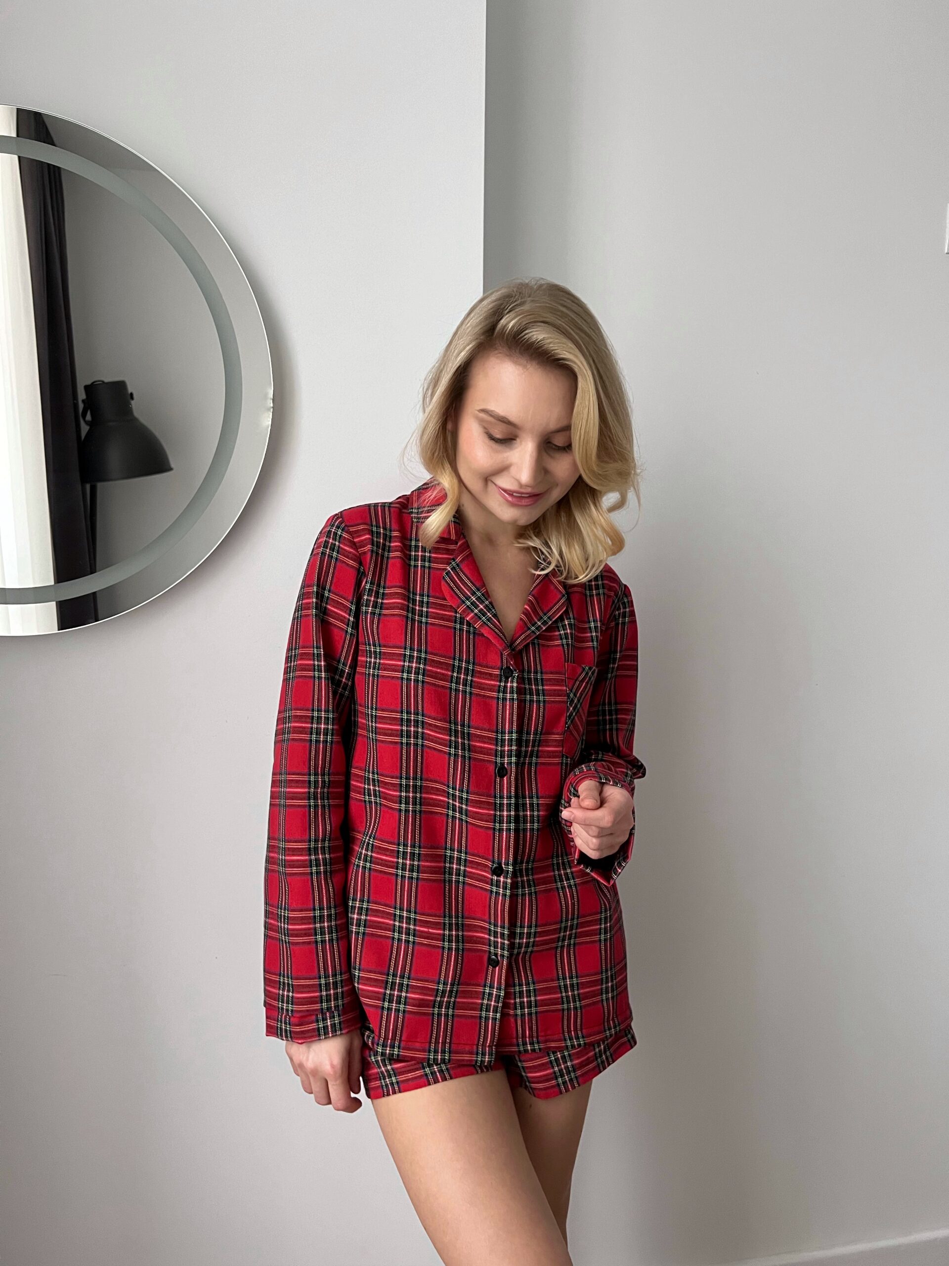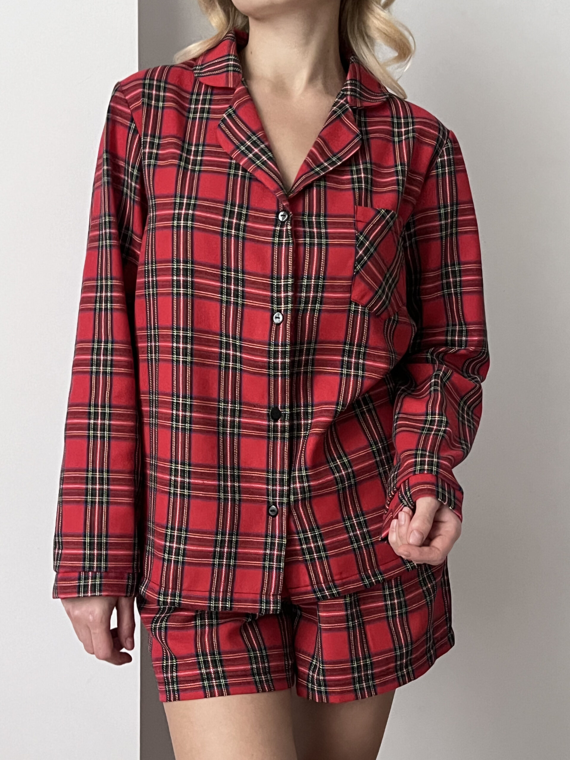 Pyjama set made from soft, breathable fabric featuring a classic red tartan pattern. Designed with a relaxed fit, the set includes a long-sleeve button-up shirt with a classic collar and matching shorts with an elastic waistband, offering lightweight comfort and ease of movement for warmer nights.